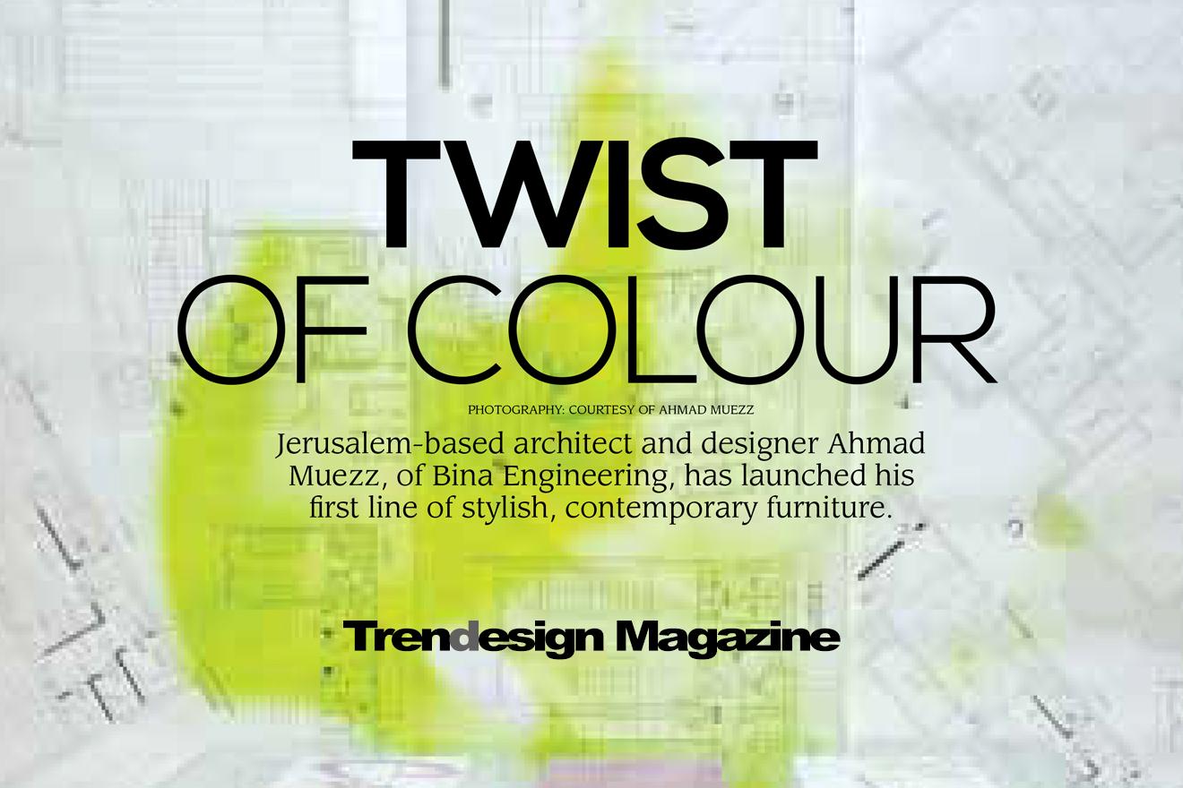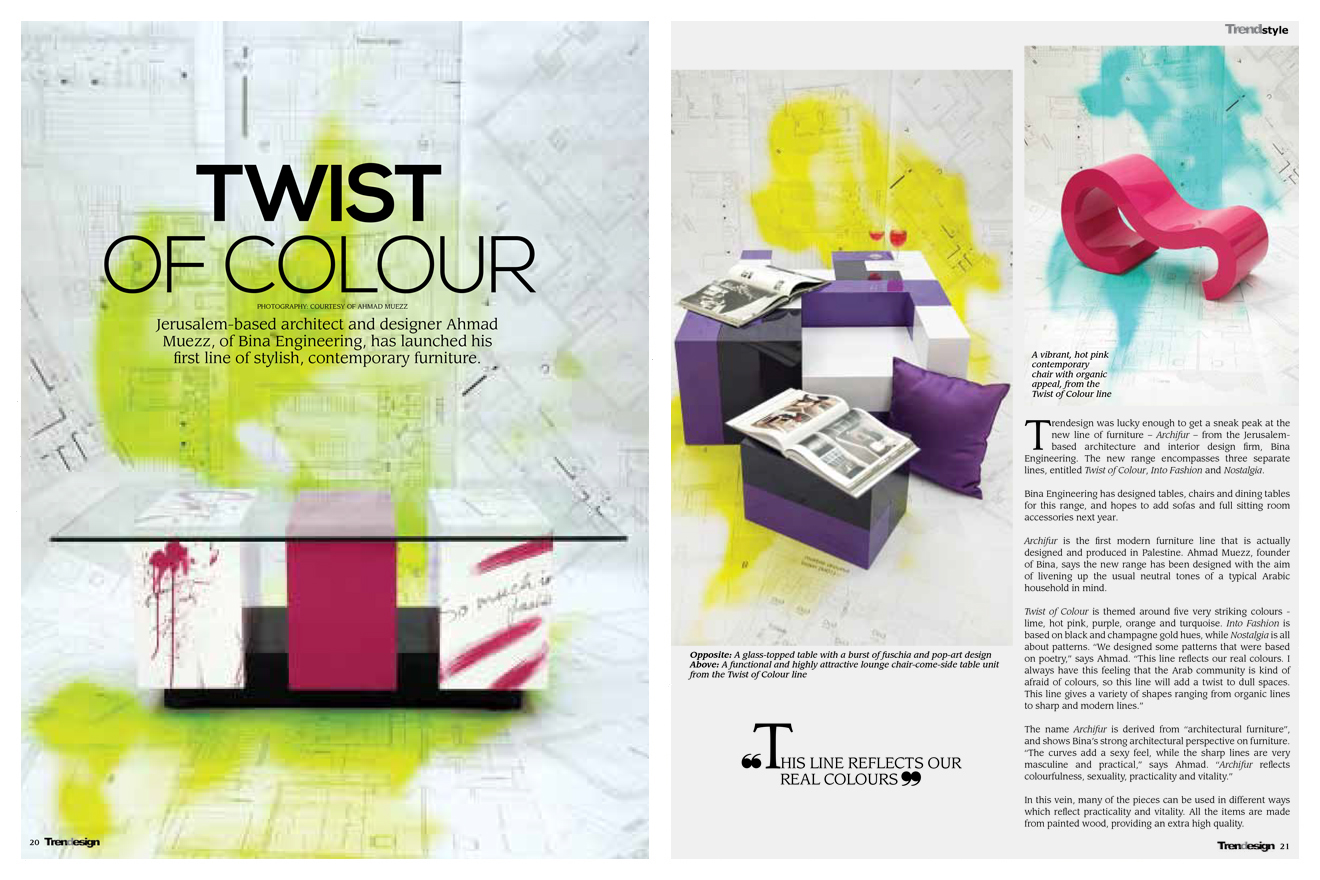 T rendesign was lucky enough to get a sneak peak at the new line of furniture – Archifur – from the Jerusalembased architecture and interior design firm, Bina Engineering. The new range encompasses three separate lines, entitled Twist of Colour, Into Fashion and Nostalgia. Bina Engineering has designed tables, chairs and dining tables for this range, and hopes to add sofas and full sitting room accessories next year. Archifur is the first modern furniture line that is actually designed and produced in Palestine. Ahmad Muezz, founder of Bina, says the new range has been designed with the aim of livening up the usual neutral tones of a typical Arabic household in mind. Twist of Colour is themed around five very striking colours - lime, hot pink, purple, orange and turquoise. Into Fashion is based on black and champagne gold hues, while Nostalgia is all about patterns. “We designed some patterns that were based on poetry,” says Ahmad. “This line reflects our real colours. I always have this feeling that the Arab community is kind of afraid of colours, so this line will add a twist to dull spaces. This line gives a variety of shapes ranging from organic lines to sharp and modern lines.” The name Archifur is derived from “architectural furniture”, and shows Bina’s strong architectural perspective on furniture. “The curves add a sexy feel, while the sharp lines are very masculine and practical,” says Ahmad. “Archifur reflects colourfulness, sexuality, practicality and vitality.” In this vein, many of the pieces can be used in different ways which reflect practicality and vitality. All the items are made from painted wood, providing an extra high quality .