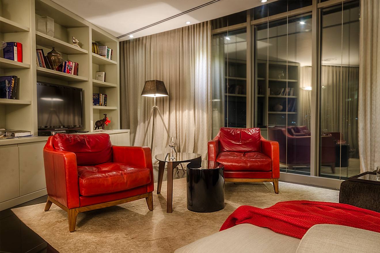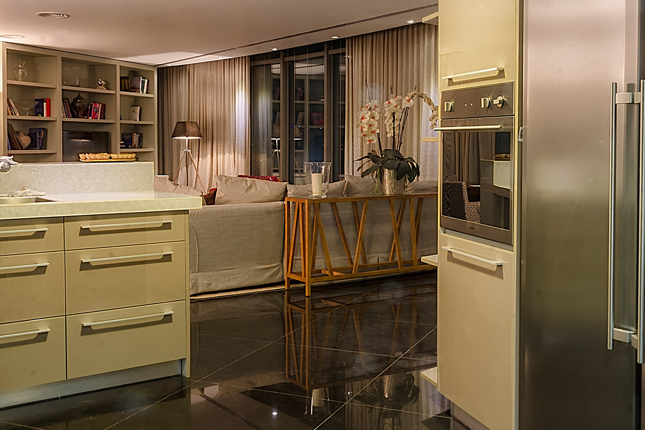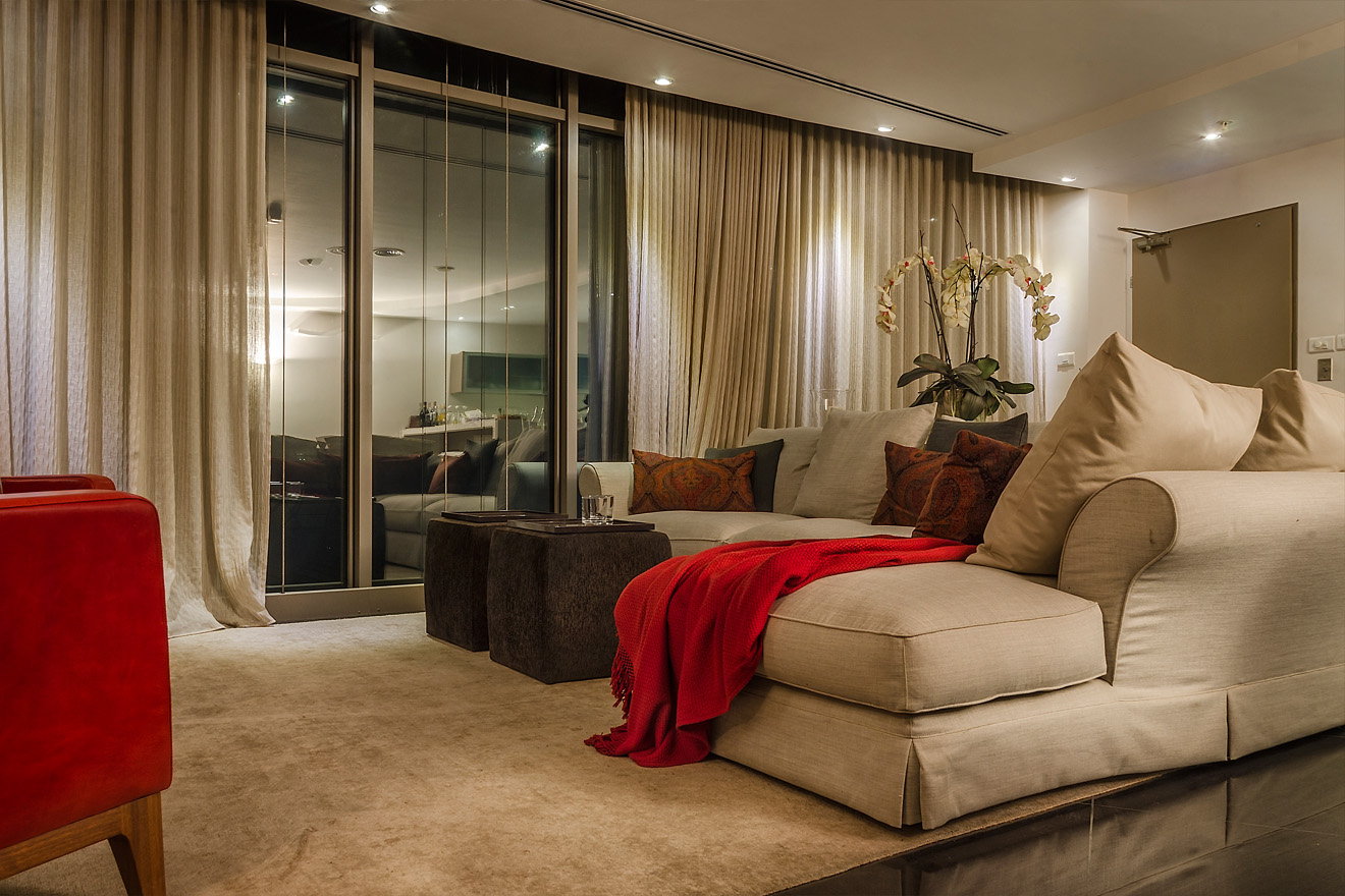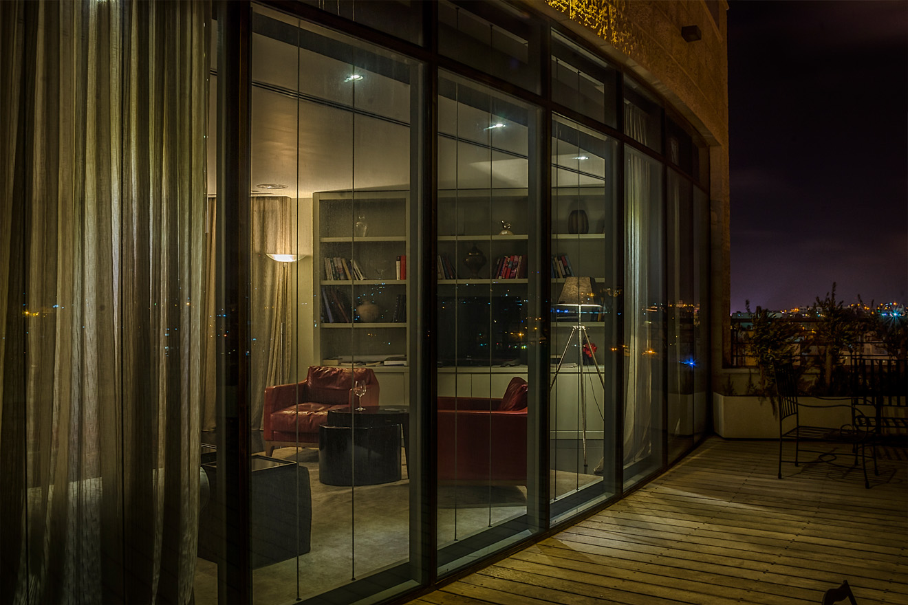 Located at the Nashashibi building in the heart of Jerusalem, this spacious rooftop apartment was designed by Ahmad Muezz. It benefits from spectacular views overlooking Jerusalem. While designing this spectacular space the intention was to balance between the classic and modern architecture to meet up with the luxurious lifestyle of the client. The calm colors, patterns and textures define the character of this apartment. The open design here allows the color scheme from the kitchen– beige with pops of red – to spill over into the living room, making the whole space feel unified. Natural materials, light textiles, utilitarian forms, and sharp angles come together to define a varied yet cohesive character within this stylish apartment. The dramatic, black reflective floor makes the apartment look larger yet gives it an elegant feel. Red was used as an accent color as to add drama, passion and warmth. It’s not a color for the faint of heart, but when thoughtfully used it can make a space come alive.